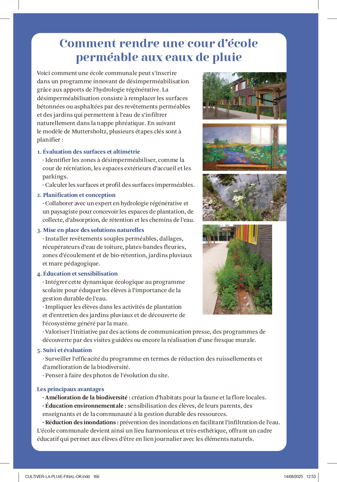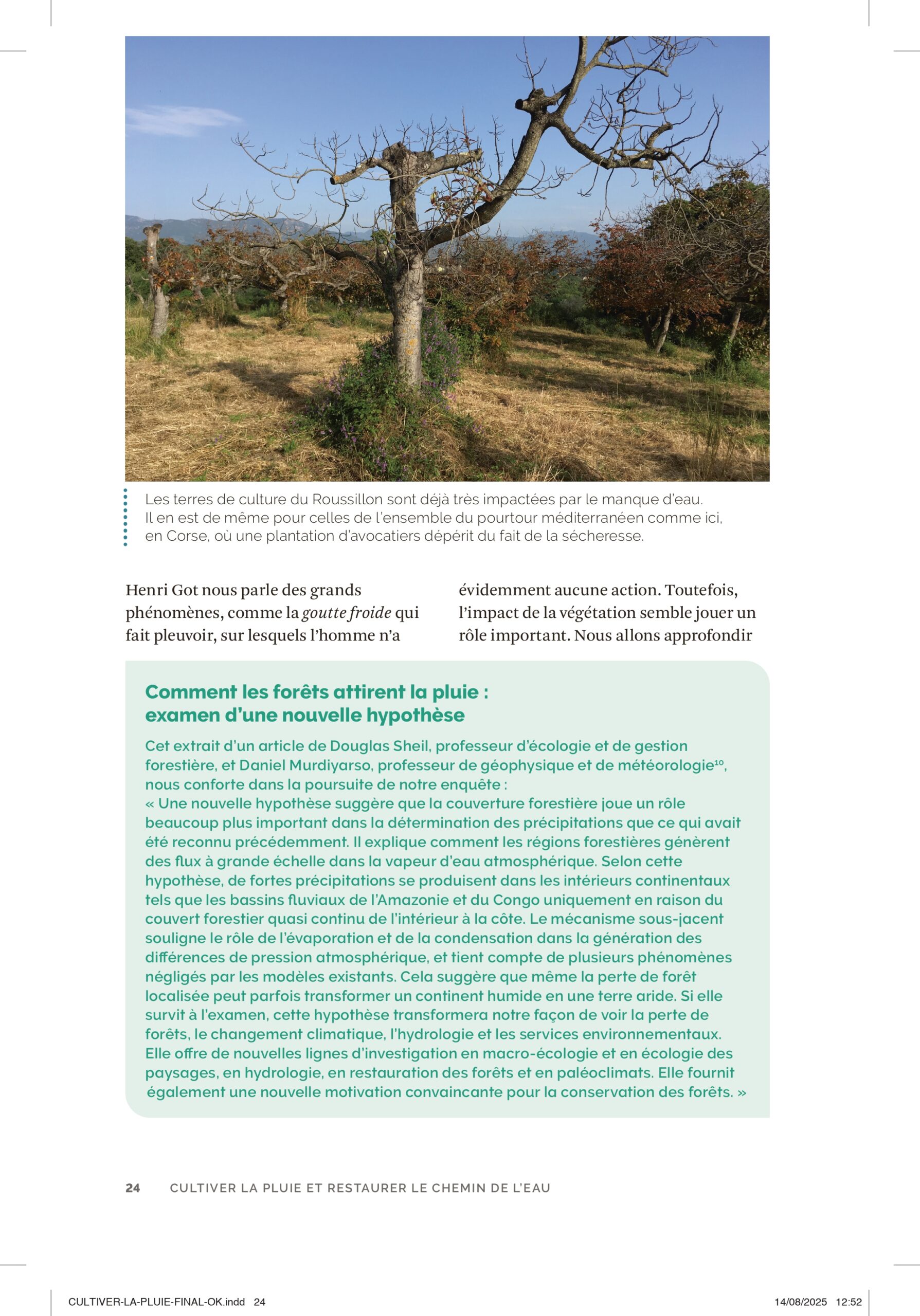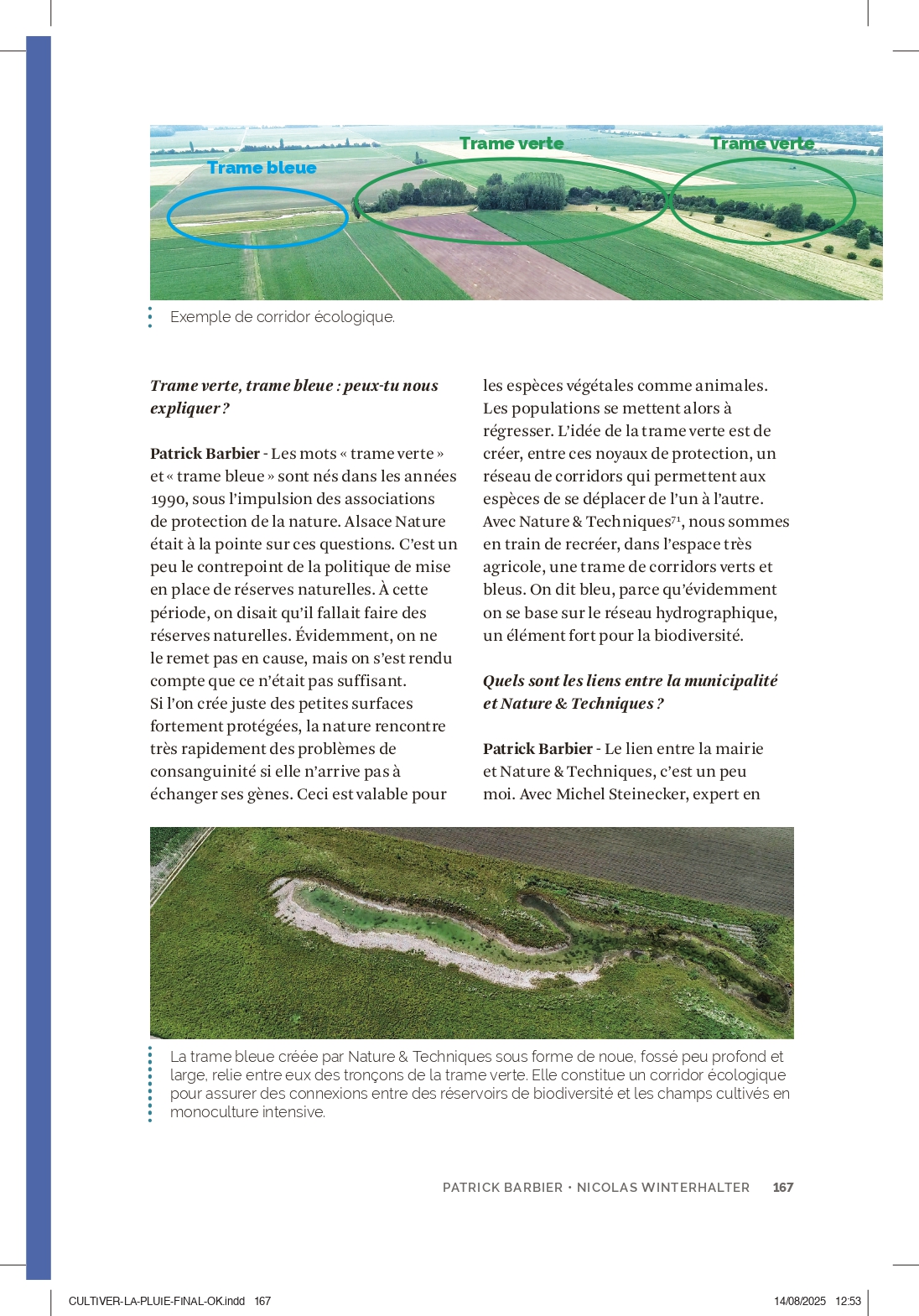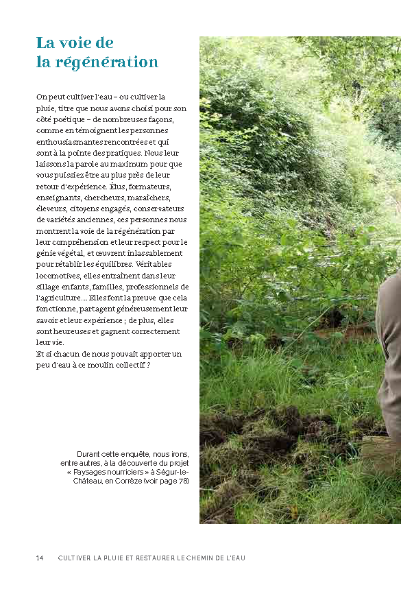 Le livre traite d’hydrologie régénérative, de maraîchage sur sol vivant, d’agroforesterie, des trames bleues et trames vertes, ainsi que des villes éponges.